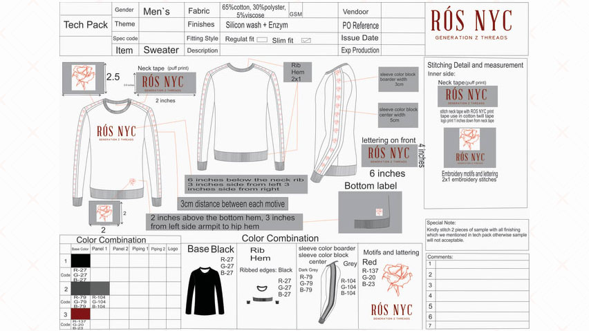بسته فنی یک برگ اطلاعاتی است که طراحان برای برقراری ارتباط با تولیدکننده برای مشخص کردن تمامی اجزای لازم برای ساخت یک محصول ایجاد میکنند. به طور معمول آنها مواردی همچون اندازهها، پارچه، رنگ، خرجکار، سایزبندی و غیره را در این بسته ارائه میدهند. تمامی جنبههای مهم در طراحی شما باید در بسته فنی توصیف شده و هرچه جزئیات آن بیشتر باشد، خطای کمتری محتمل است.